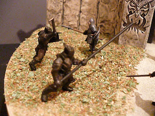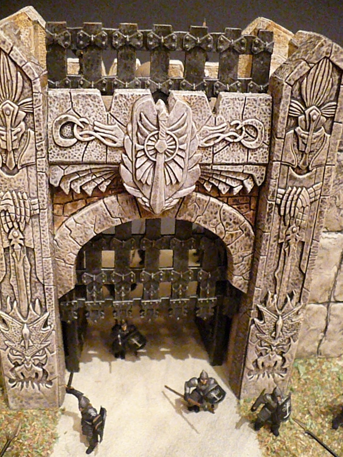 All miniatures wargame are the Lord of the Rings (GW) and are made of plastic, in the usual scale: 28 mm. The walls are self-made with sheets of masonite (MDF: the backs of frames per day), I have engraved with the graver round head of an electric minitrapano (like Dremel) and covered with pieces of flattened Das left hand and irregular.