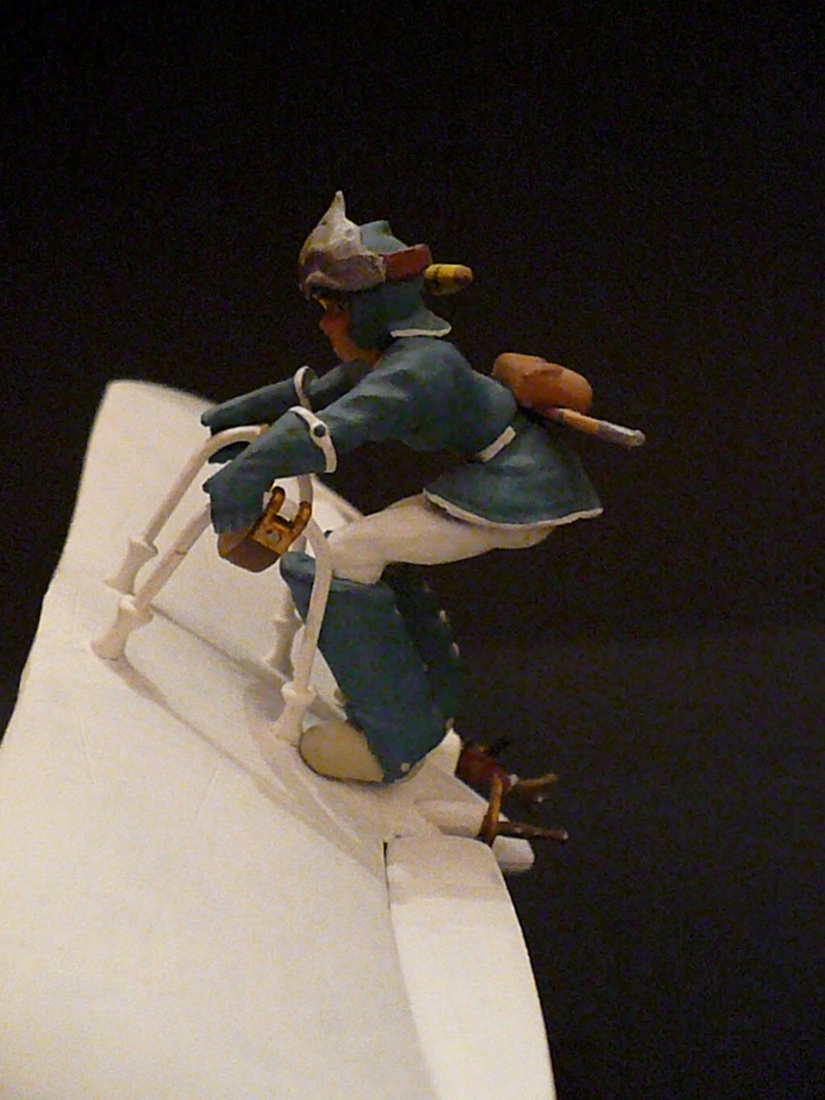 On the front is armored shield that protects the face in combat, while we see on the chest the cartridges with the bullets for the rifle: